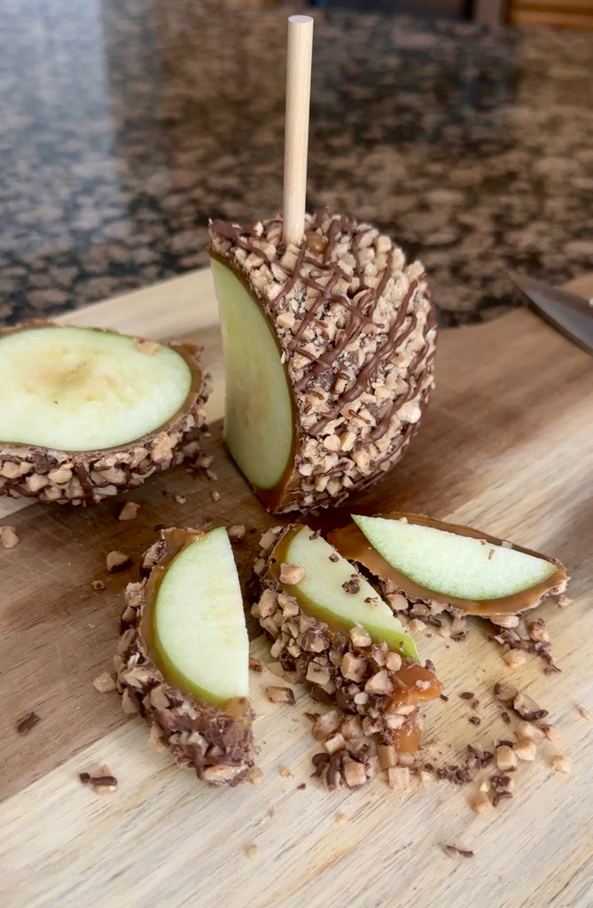 Delicious, crisp Granny Smith apples smothered in 100% homemade caramel and mouthwatering toppings. This Heath® apple features the world famous toffee-filled Heath® candy bar and rich, melted ribbons of milk chocolate!