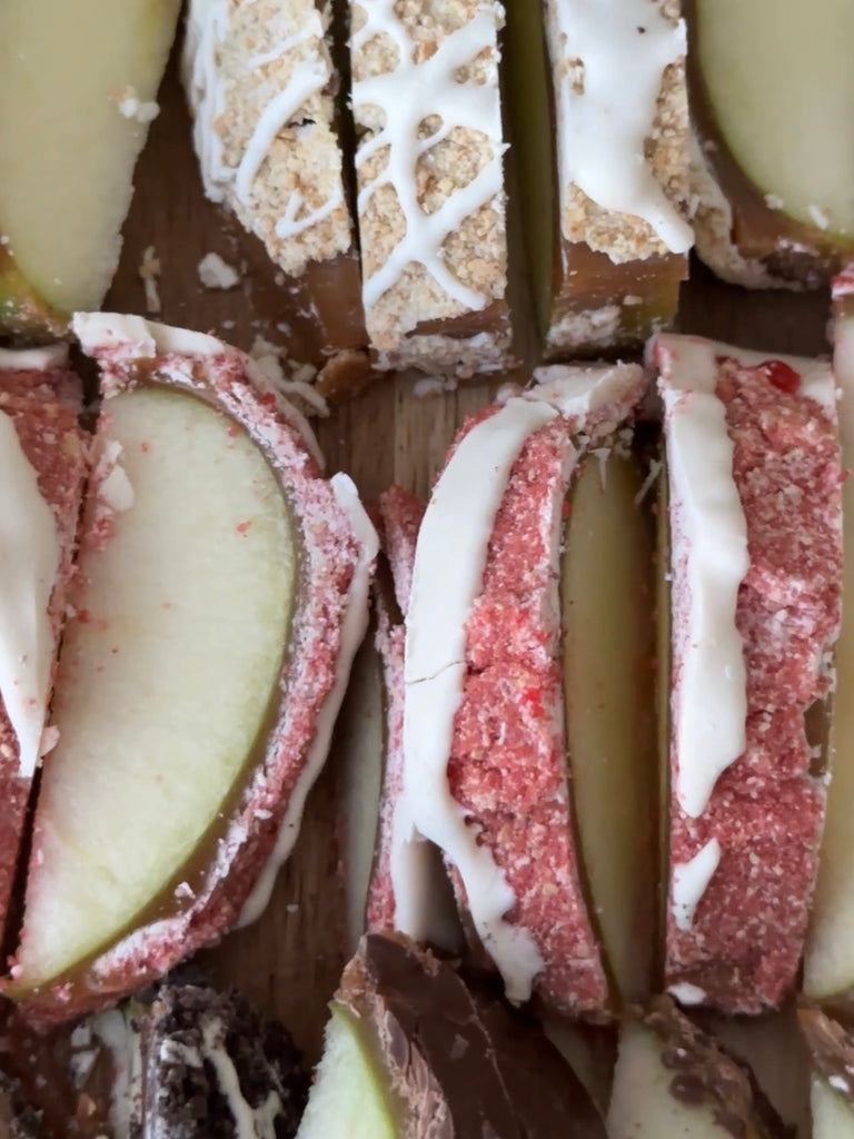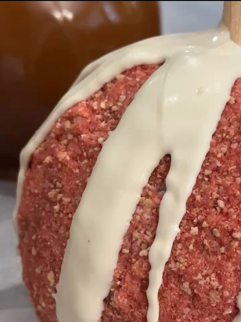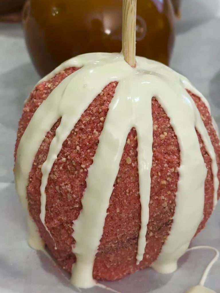 Delicious, crisp Granny Smith apples smothered in 100% homemade caramel and mouthwatering toppings. This Raspberry Shortcake apple features rich, melted ribbons of white chocolate with delicious crumbles of graham crackers and raspberry spices & flavors!